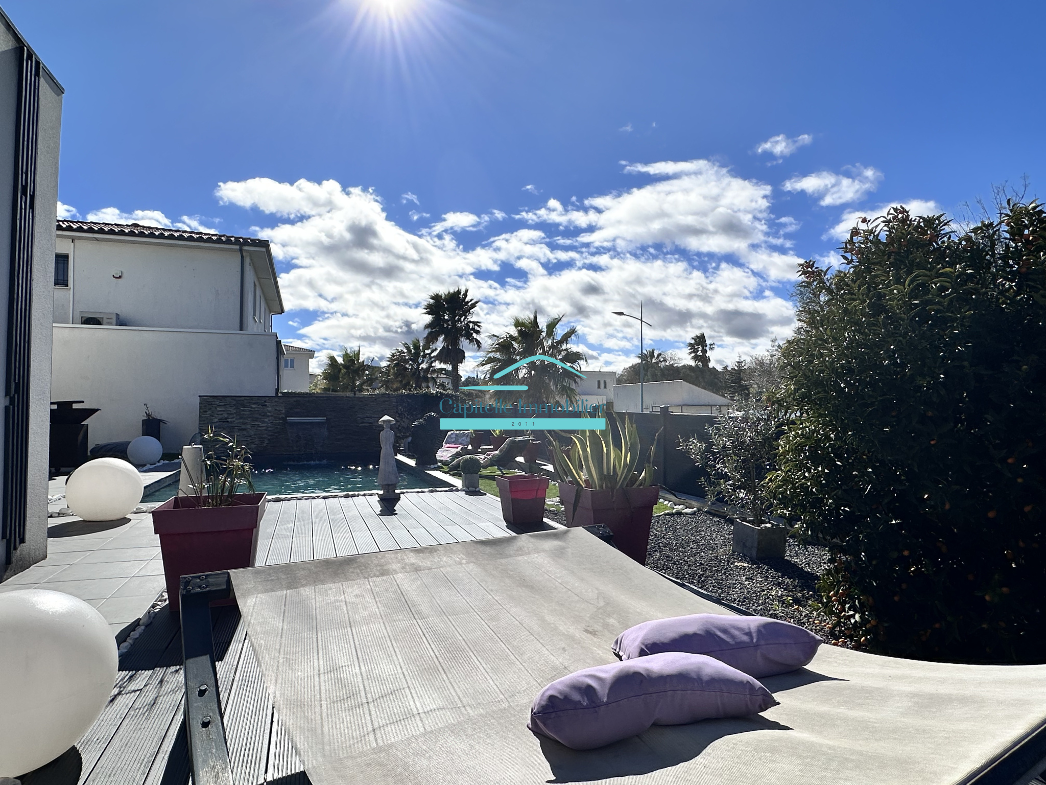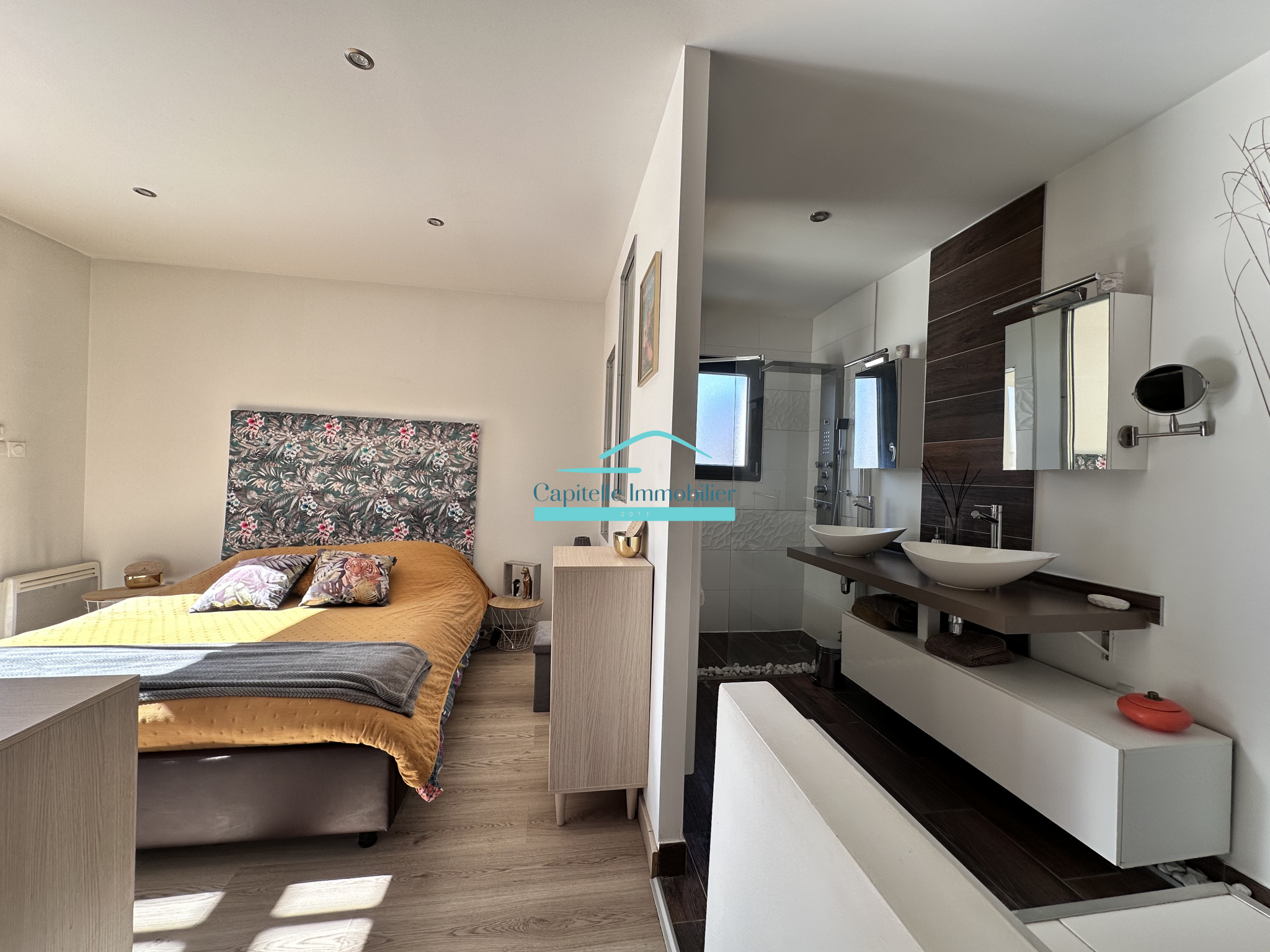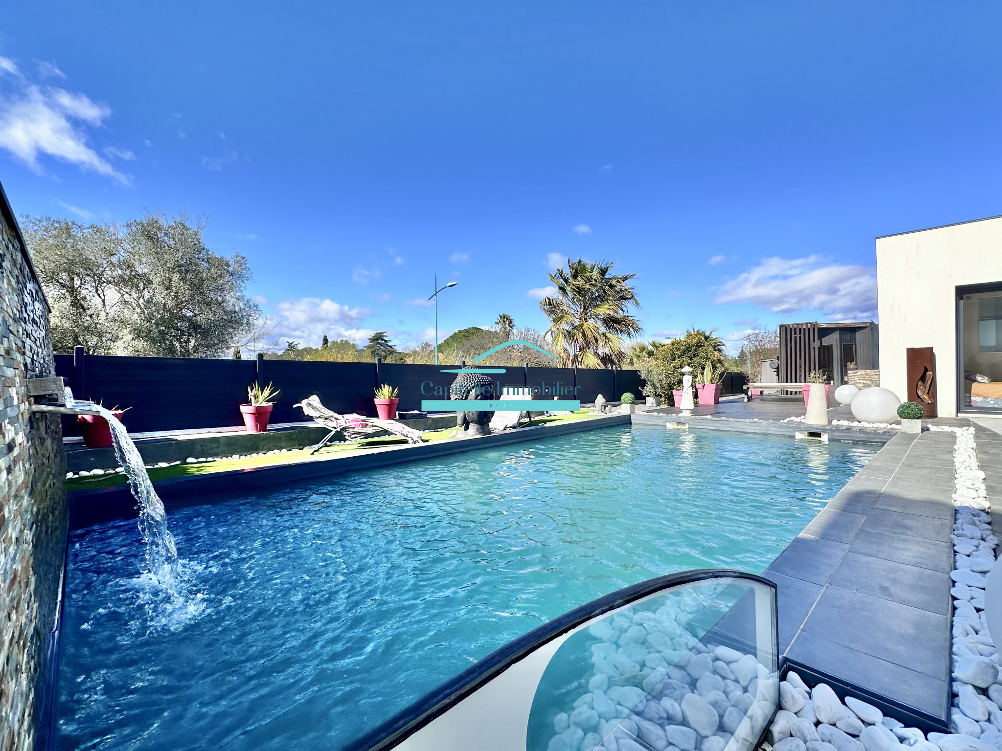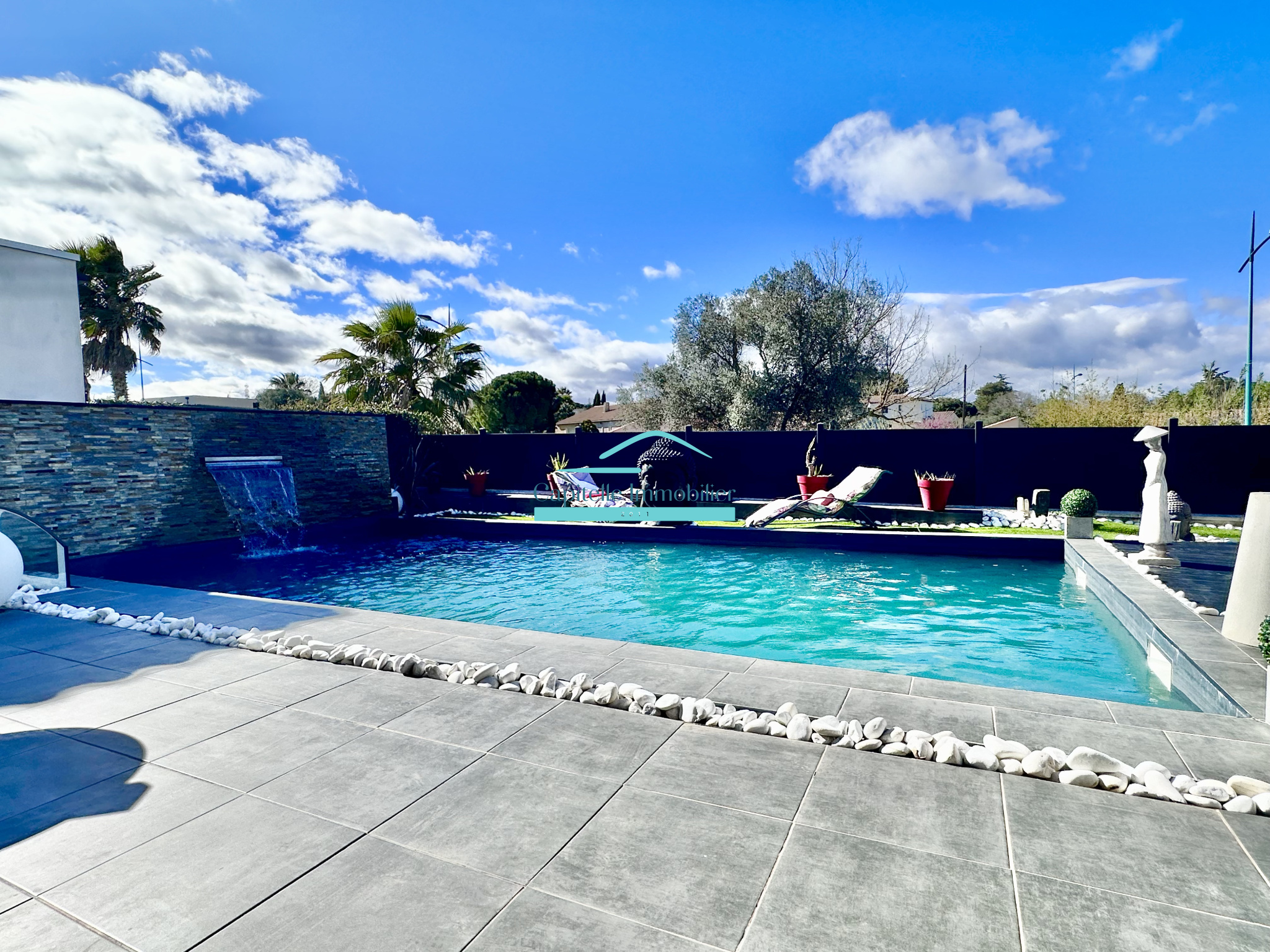 À l’extérieur, un véritable espace de bien-être : piscine 4x8 avec cascade, sauna, bassin à poissons, terrain de pétanque et terrasses aménagées.