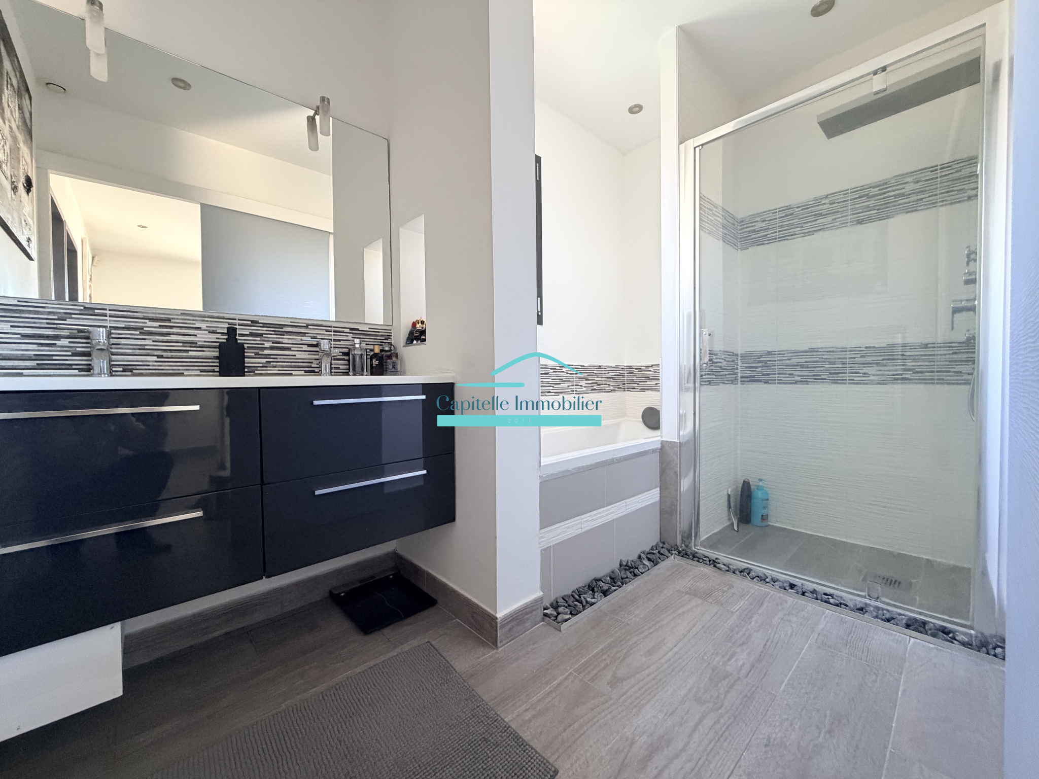 Le rez-de-chaussée accueille une suite parentale raffinée avec dressing, baignoire balnéo, douche à l’italienne et double vasques.